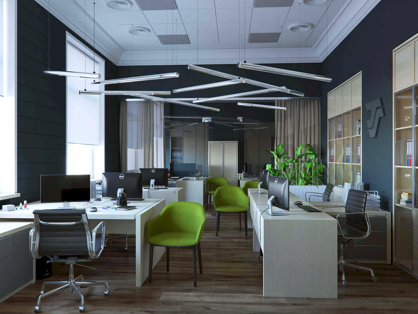 Современные направления в оформлении рабочих пространств нацелены на создание комфортного и стимулирующего к продуктивности атмосферы. Главное внимание уделяется функциональности и эстетике, обеспечивая при этом здоровое и мотивирующее окружение для работников.